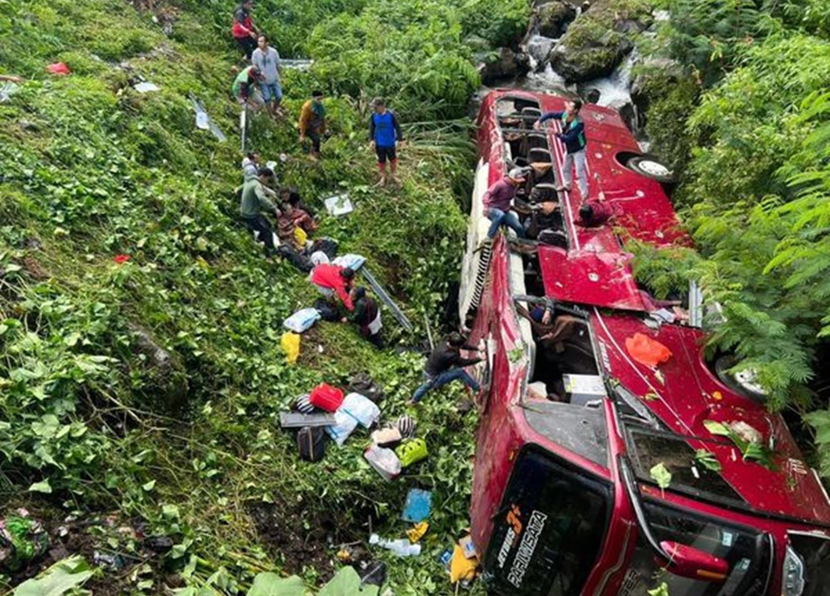 INVENTIF – Musibah dialami sebuah bus pariwisata yang terjun ke jurang di Kawasan Wisata Guci, Tegal sesaat setelah ditinggalkan sopir untuk mengobrol dan minum kopi, Minggu (7/5/2023).