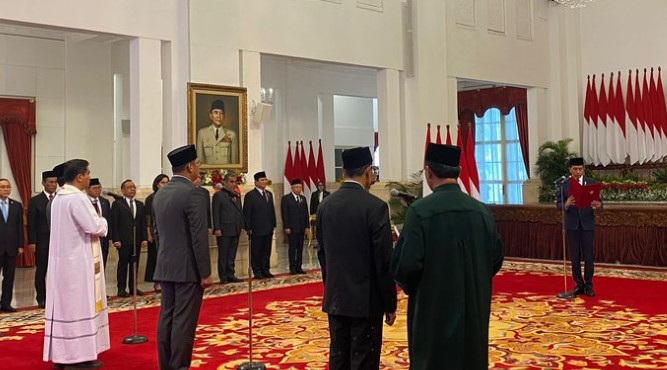 Usai Keppres dibacakan, Kepala Negara memimpin pembacaan sumpah jabatan yang diikuti oleh Wakil Menteri Investasi dan dua wakil menteri lainnya. “Demi Allah saya bersumpah, bahwa saya akan setia kepada UUD Negara Republik Indonesia Tahun 1945 serta akan menjalankan segala peraturan perundang-perundangan dengan selurus-lurusnya demi darma bakti saya kepada bangsa dan negara,” kata Yuliot mengikuti sumpah yang dibacakan Jokowi di Istana Negara, Jakarta Pusat, Kamis.
